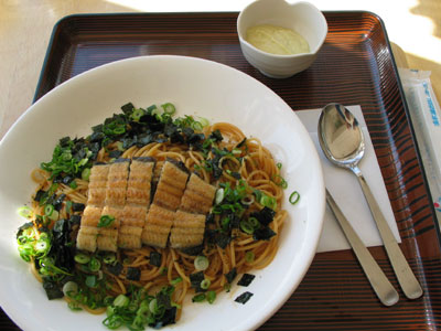 醤油風味付けのパスタに、塩焼きしたうなぎがのせてあります。