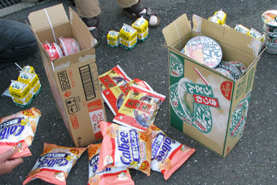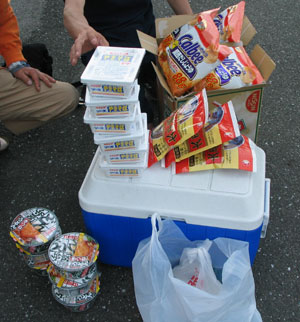 当方は、レモン牛乳、ぺヤングカップ焼きそば、どん兵衛(東版)を持参しました。