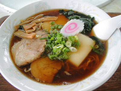 ちぢれ麺の醤油ラーメンにチャーシューとお餅が2個ずつ入っています。