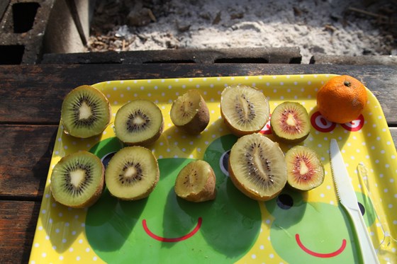 キウイはプラスチックナイフでさくさく切れる柔らかさ。右端の紅鮮が甘さがあって1番かと