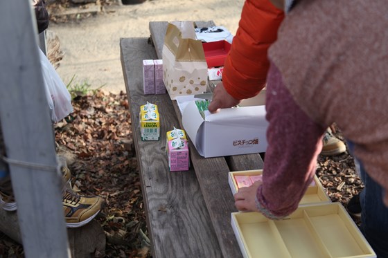 盛り上がる中、園内イベントの餅つき大会で、途中休憩