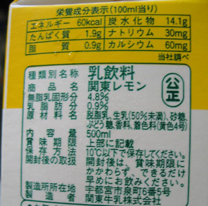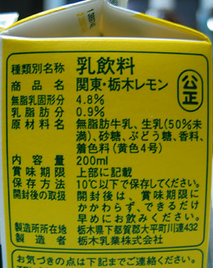 | 宇都宮市限定販売の乳飲料。子供のころから慣れ親しんでいる飲み物です。 ほのか(「かすか」かな)にレモン風味の甘い味がします。 その昔は「レモン牛乳」と名乗っていましたが、生乳50%以下の為、 ※2004.10.18追記 ※2004.11.14追記+写真掲載 ※2005.4.2追記 レモンと表記はありますが「無果汁」です。(本当にレモン果汁入りだと牛乳は凝固しますね) なぜレモンなのかはグラスに注いで見てくださいね。(黄色4号がポイント!) |