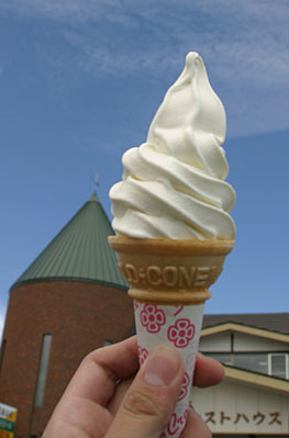 | 霧降有料道路の終点先にある、今市市の大笹牧場レストハウスにて販売されているソフトクリーム。 300円 ブラウンスイス牛の牛乳を使用した程よい甘さのソフトクリームです。 ツーリングの途中での息抜きにぴったり。ただし名物なので買うのには少し並びます・・。 |
