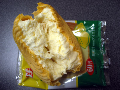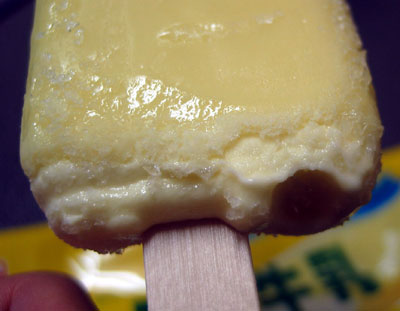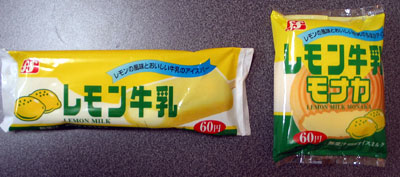 食べ初めはレモン氷菓とミルクアイスの味が別々に感じられるのですが、 口の中で溶け合うと「レモン牛乳」味となります・・