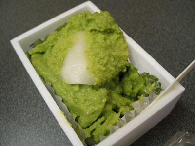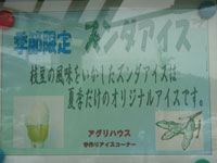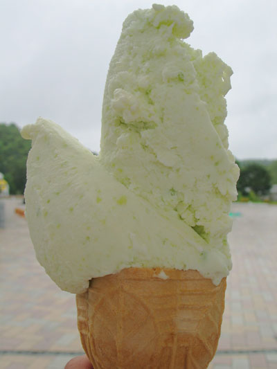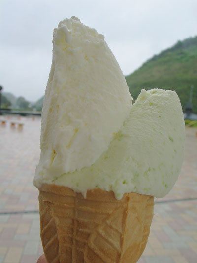 その4で紹介している道の駅「もてぎ」にて、夏期間限定で発売されている、ずんだ(枝豆)を使ったアイスです。(写真はダブル・300円、シングルは250円) ミルクたっぷりで、しつこくない甘さと相まってこれもおいしいです。 |